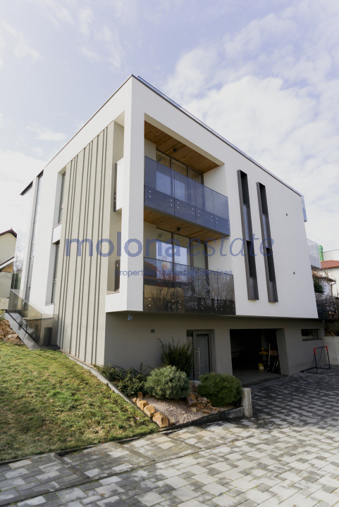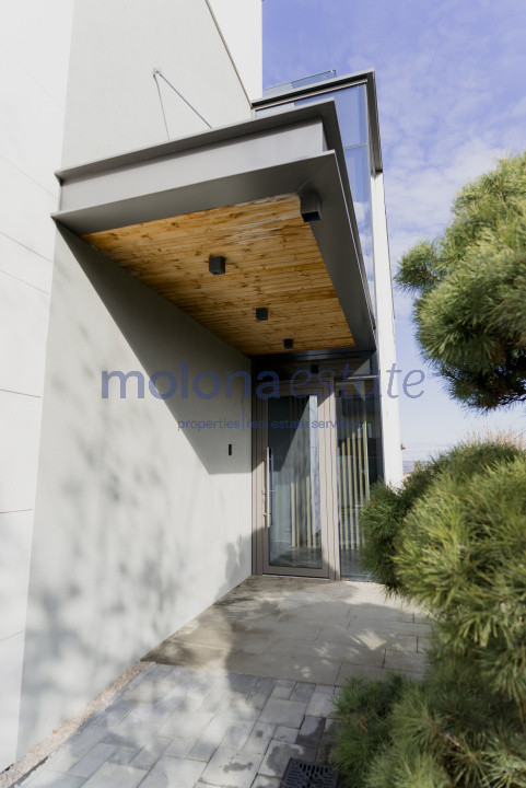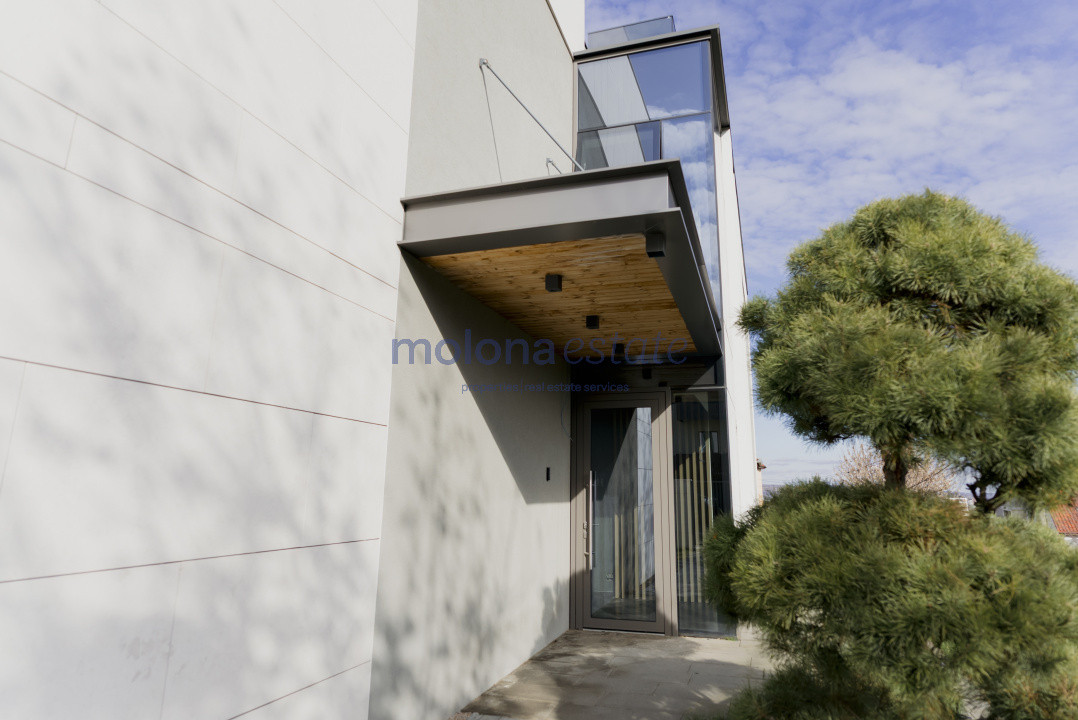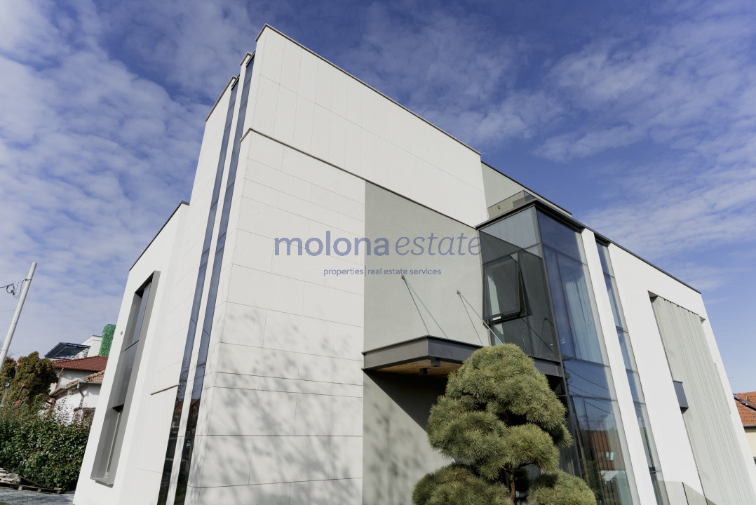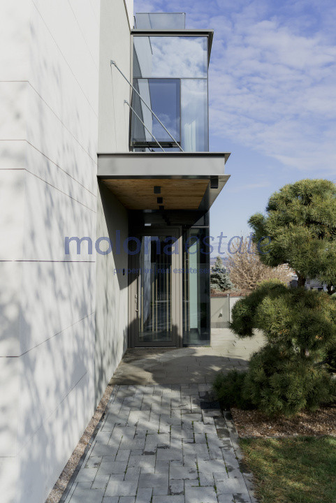 Fațadele vitrate ample pun în valoare arhitectura contemporană și creează o conexiune armonioasă între interior și exterior. Proprietatea este situată într-o zonă rezidențială liniștită, cu acces rapid către centrul orașului.